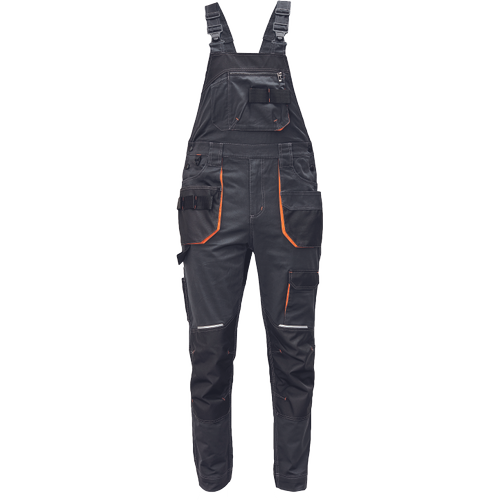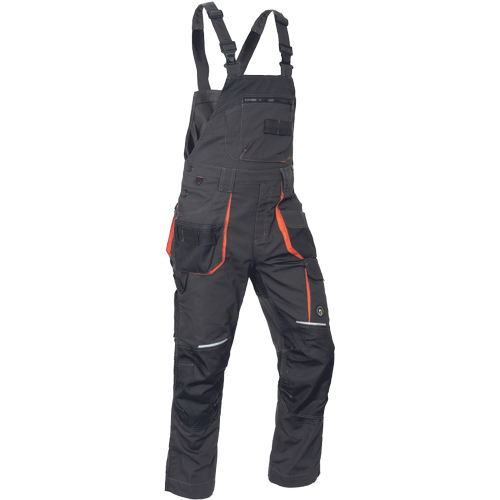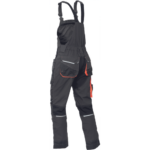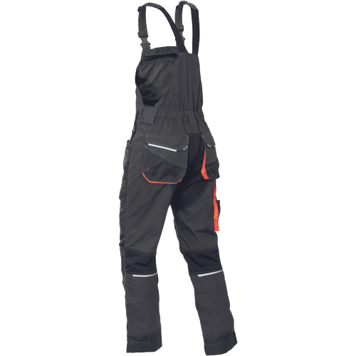 • męskie robocze spodnie ogrodniczki z elastycznym pasem i wielofunkcyjnymi kieszeniami • wzmocnienia Oxford 600D na kolanach umożliwiające włożenie nakolanników • wytrzymałe potrójne szwy w nogawkach i w kroku • elementy odblaskowe • możliwość wydłużenia nogawek