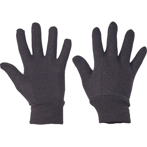Rękawice szyte z brązowego, bawełnianego dżerseju, elastyczny ściągacz.
