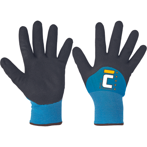 Ocieplane, bezszwowe rękawice. Warstwa zewnętrzna wykonana z poliestru, warstwa wewnętrzna wykonana z akrylu. Dwukrotnie powlekane czarnym nitrylem z wykończeniem o chropowatej strukturze.