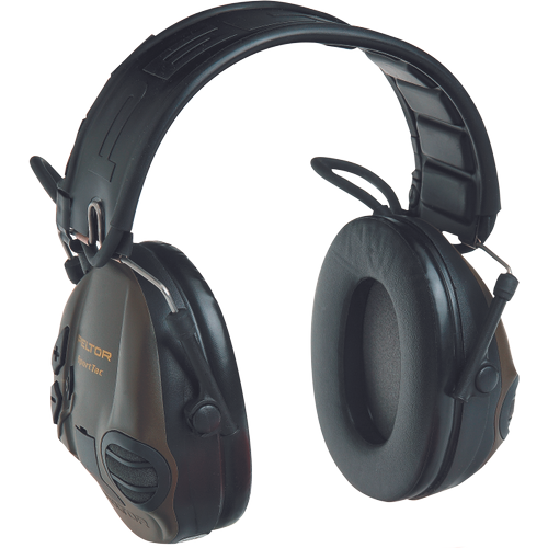 Zielony ochronnik słuchu, z bardzo płaskimi czaszami, składanym pałąkiem, z urządzeniem elektronicznym tłumiącym hałas zewnętrzny i wzmacniającym mowę ludzką, z możliwością połączenia z systemami komunikacyjnymi. Odpowiednie na strzelnicę.