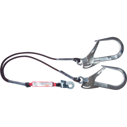 Lanex Double Shock absorber; fall arrester with two ropes and carabiner hooks; carabiner on shock absorber and hooks with 100 mm opening on ropes; the shock absorber can be used for climbing structures, poles and ladders; meets the EN 355 standard