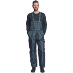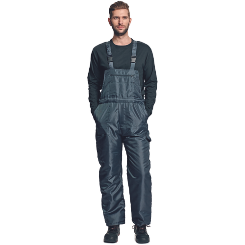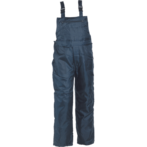 • ocieplane spodnie ogrodniczki • wiatroszczelne, wodoodporne • zapinane z boku na guziki • regulowane szelki zapinane na klamry wykonane z PVC • z kieszenią na miarę i pętelka na młotek
