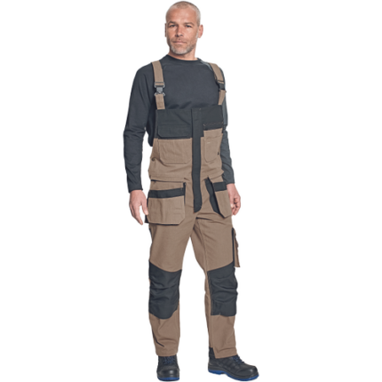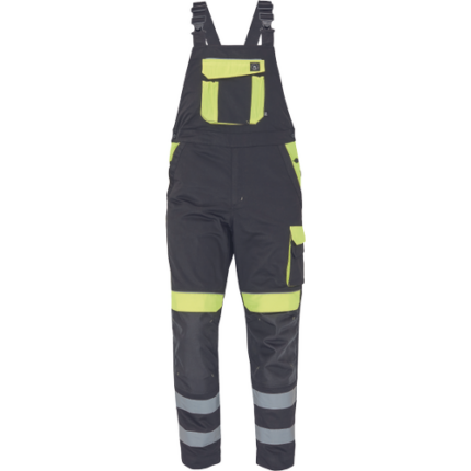 • męskie robocze spodnie ogrodniczki z elastycznym pasem • szerokie szelki z plastikowymi klamrami • 2 kieszenie boczne, 1 podwójna kieszeń na lewym udzie • 1 duża kieszeń na piersi, 2 kieszenie tylne, 2 małe kieszenie na prawym udzie • na kolanach wzmocnienia z materiału Oxford 600D z możliwością włożenia nakolanników • możliwość wydłużenia nogawek • odblaskowa lamówka