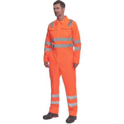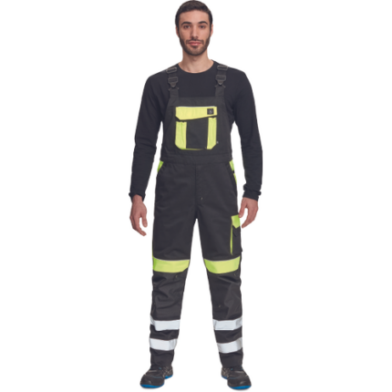 • męski roboczy kombinezon Hi-Vis z odblaskowymi taśmami • wokół ciała taśmy o szerokości 5 cm • wokół nóg taśmy o szerokości 7 cm • zamek zasłonięty plisą • 2 kieszenie boczne + 1 kieszeń na monety • 2 wielofunkcyjne kieszenie boczne na nogawkach • 2 tylne kieszenie • 1 duża kieszeń z patką na piersi • elastyczne wstawki w talii • możliwość wydłużenia nogawek