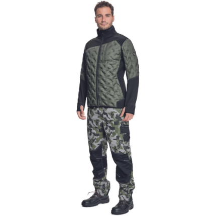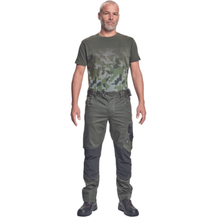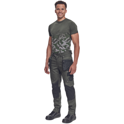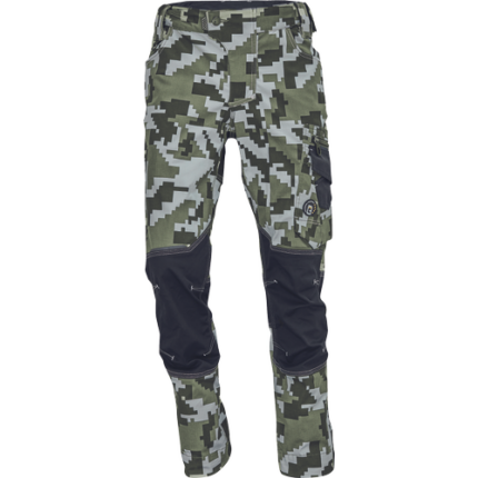 • męskie spodnie robocze z elastycznego materiału Trifibetex® z nadrukiem moro • 2 przednie kieszenie klinowe • 2 tylne naszywane kieszenie zapinane na rzep, po lewej stronie duża kieszeń wielofunkcyjna, po prawej stronie wielofunkcyjne kieszenie na miarę i nóż + uchwyt na ołówek, metalowy pierścień „D”, wzmocnione nakolanniki z tkaniny CORDURA, paski na narzędzia • patent elastycznego pasa • ozdobne potrójne szwy w kontrastowym kolorze • możliwość wydłużenia nogawek • odblaskowe detale ton w ton