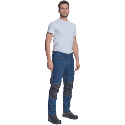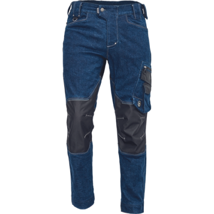 męskie spodnie robocze z elastycznego jeansu "pre-washed" połączonego z elementami unikalnego, trwałego materiału CORDURA®, TrifibetexPRO® i Trifibetex® w miejscach wymagających wzmocnienia, 2 przednie kieszenie klinowe, 2 tylne naszywane kieszenie zapinane na rzep, po lewej stronie duża kieszeń wielofunkcyjna, po prawej stronie wielofunkcyjne kieszenie na miarę i nóż + uchwyt na ołówek, metalowy pierścień „D”, wzmocnione nakolanniki z tkaniny CORDURA®, paski na narzędzia, patent elastycznego pasa, możliwość wydłużenia nogawek