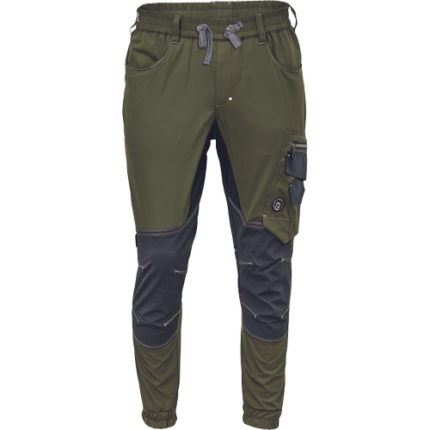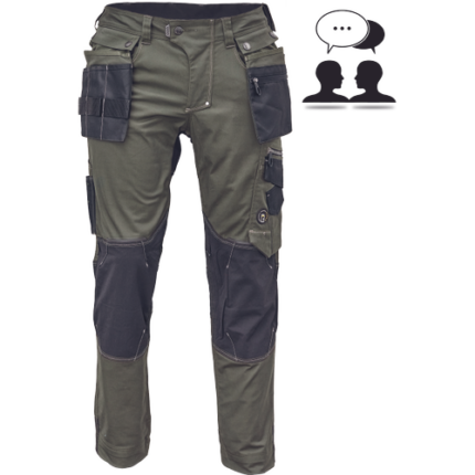 • męskie spodnie robocze z elastycznego materiału Trifibetex® • 2 przednie kieszenie klinowe, 2 tylne naszywane kieszenie zapinane na rzep, po lewej stronie duża kieszeń wielofunkcyjna, po prawej stronie wielofunkcyjne kieszenie, na miarę i nóż + uchwyt na ołówek • metalowy pierścień „D”, wzmocnione nakolanniki z tkaniny CORDURA, paski na narzędzia • patent elastycznego pasa • ozdobne potrójne szwy w kontrastowym kolorze • możliwość wydłużenia nogawek • odblaskowe detale ton w ton