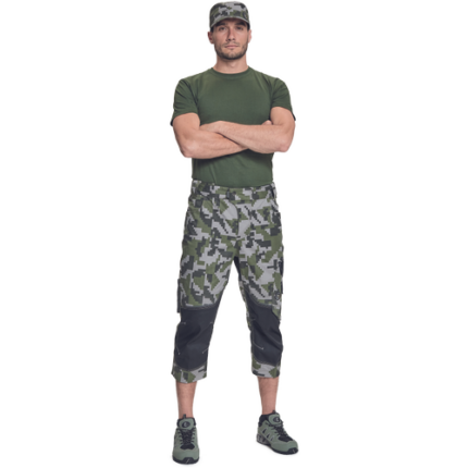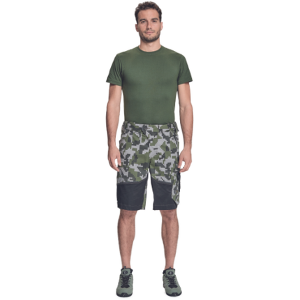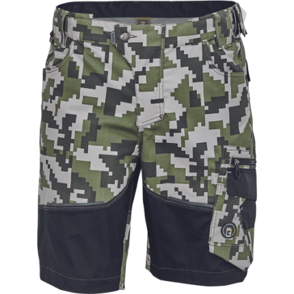 • męskie szorty robocze z elastycznego materiału Trifibetex® z nadrukiem moro • 2 przednie kieszenie klinowe, 2 tylne naszywane kieszenie zapinane na rzep, po lewej stronie duża kieszeń wielofunkcyjna, po prawej stronie wielofunkcyjne kieszenie na miarę i nóż + uchwyt na ołówek • metalowy pierścień „D”, paski na narzędzia, patent elastycznego pasa • ozdobne potrójne szwy w kontrastowym kolorze • odblaskowe detale ton w ton