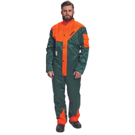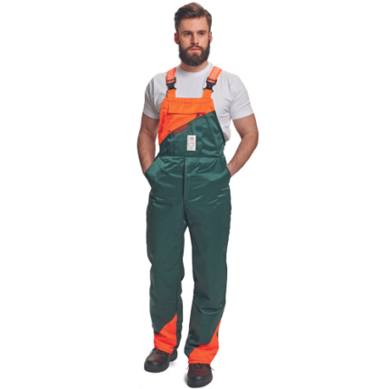 • wewnętrzna podszewka chroniąca przed przecięciem od wysokości pasa do końca nogawek • regulowana długość • zapinane plastykową klamrą • kieszeń piersiowa zapinana na zamek błyskawiczn • boczne zapięcia na zamek błyskawiczny oraz guzik • naszyta kieszeń tylna z patką zapinaną na rzep • kieszeń na miarkę