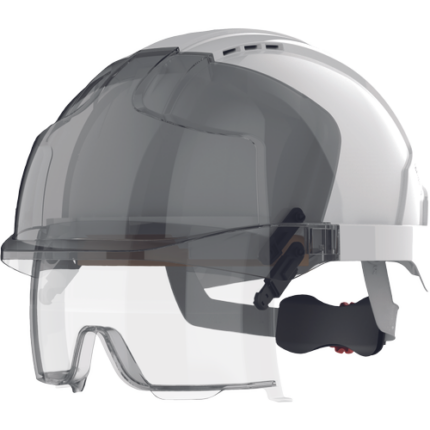 The EVO® VISTAlens® Safety Helmet with Integrated Goggles - White / Smoke is a next-generation, feature-rich safety helmet based on the proven Evolution® head protection technology, which includes fully retractable integrated eye protection with optical class 1 and impact resistance B; goggles are interchangeable, allowing users to swap out the premium for a VISTAshield® face shield to keep the right protection on hand when needed; the helmet features a Revolution® Flex ratcheting harness and is designed to reduce pressure for a perfect fit and all-day comfort