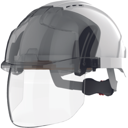 EVO® VISTAshield® Safety Helmet with Integrated Faceshield is a next generation feature-rich safety helmet based on proven Evolution® head protection technology, incorporating a fully retractable optical class 1 integrated faceshield with A-rated impact resistance. The eyewear is interchangeable, allowing users to swap the faceshield for a VISTAlens® overspec, to ensure the appropriate protection is on hand when required.