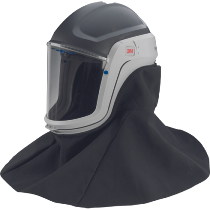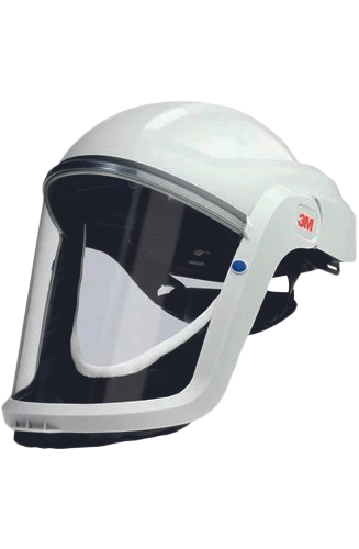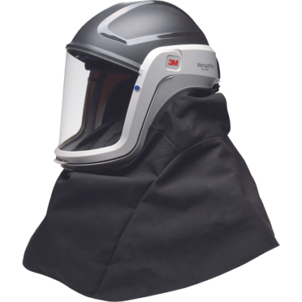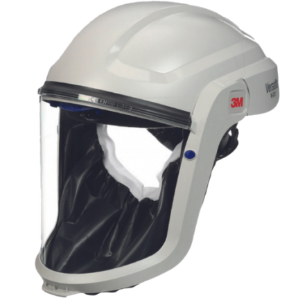 3M™ Versaflo™ helmet M-406 features a very durable protective nylon collar and a deflector that helps direct airflow inside the headpiece; the helmet has a visor with good peripheral vision and a downward view; the visor is coated with a polycarbonate layer for greater resistance to scratches and chemicals