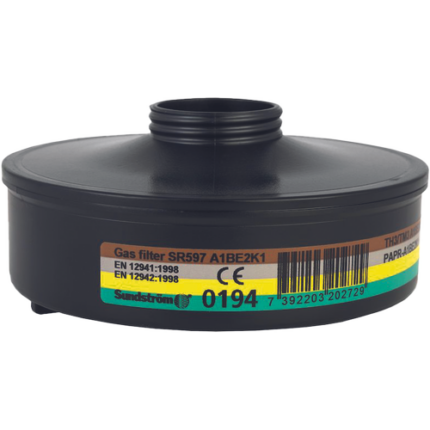 Pochłaniacze SR 597 A1BE2K1 przeznaczone są do stosowania w systemie z wymuszonym przepływem powietrza SR 500/SR 500 EX. W zależności od typu pochłaniacze chronią przed następującymi gazami i oparami: Typ A chroni przed gazami i oparami organicznymi, np. rozpuszczalniki o temp. wrzenia pow. +65 °C. Typ B chroni przed gazami i oparami nieorganicznymi, np. chlor, siarkowodór i cyjanowodór. Typ E chroni przed kwaśnymi gazami i oparami, np. dwutlenek siarki i fluorowodór. Typ K chroni przed amoniakiem i niektórymi aminami, np. etylenodwuamina. Jednostka wentylująca SR 500/SR 500 EX musi być stosowana zawsze z 2 filtrami przeciwpyłowymi lub 2 kombinacjami filtrów i pochłaniaczy.
