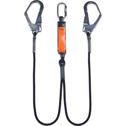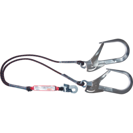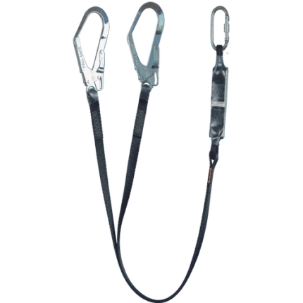 The CHIMANGO double shock absorber is made of 27 mm polyester webbing and an energy absorber that limits the impact force below 6 kN; physically connects the user to the workplace structure and stops the free fall of the user; 56 mm carbine opening; specifications: material steel and polyester; length 1.5 m; weight 1.75 kg; load capacity 120 kg; meets EN 354 and EN 355 standards