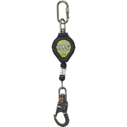 Skylotec self-retracting fall arrester PEANUT I standards: EN 360: 2002 length: 1.8 m load capacity: 135 kg weight: 1.62 kg CHARACTERISTICS: self-retracting fall arrester with webbing and integrated shock absorber and aluminum carabiner STAK TRI (opening 22 mm, 28 kN ) on the webbing is an aluminum hook FS 90 AL (opening 60 mm, 22 kN) USE: scaffolding, mobile work platforms, steel structures