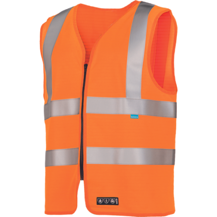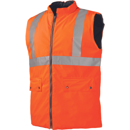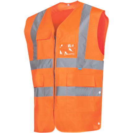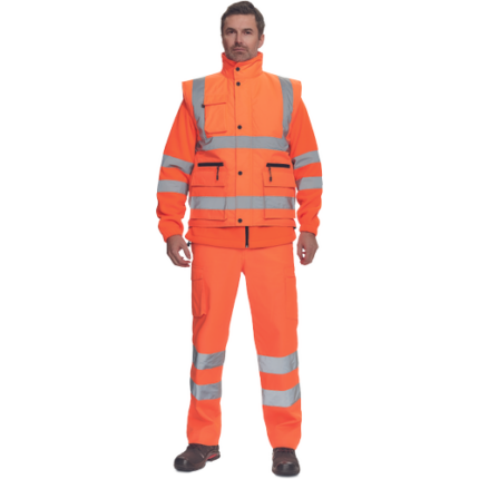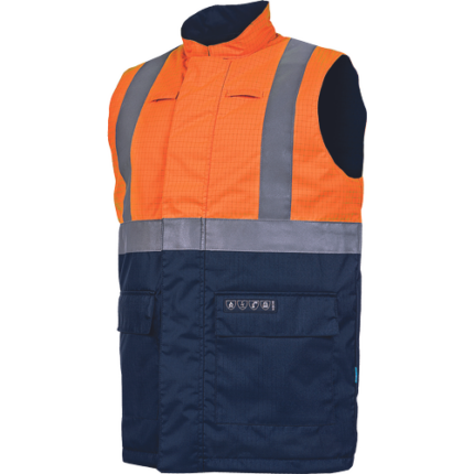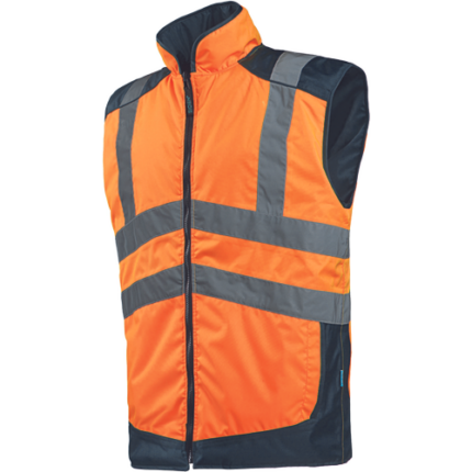 • ocieplana męska kamizelka ostrzegawcza z kapturem ukrytym w kołnierzu • odblaskowe taśmy o szerokości 5 cm na ramionach i w dolnej części • zamek błyskawiczny przykryty plisą zapinaną na guzik i• 1 kieszeń na piersi na telefon, 2 duże kieszenie przednie z patkami i 2 kieszenie z zamkami błyskawicznymi powyżej