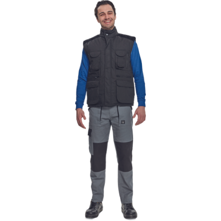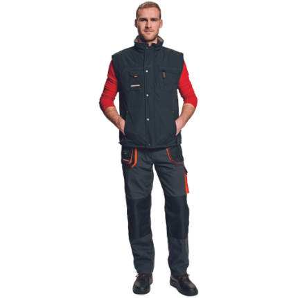 • ocieplana męska kamizelka ostrzegawcza z kapturem ukrytym w kołnierzu • odblaskowe taśmy o szerokości 5 cm na ramionach i w dolnej części • zamek błyskawiczny przykryty plisą zapinaną na guzik i• 1 kieszeń na piersi na telefon, 2 duże kieszenie przednie z patkami i 2 kieszenie z zamkami błyskawicznymi powyżej