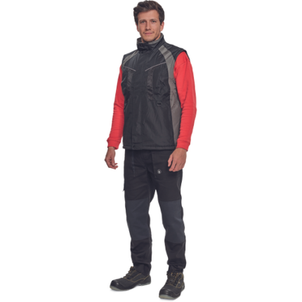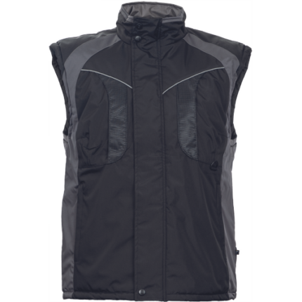 • wodoodporna, ocieplana kamizelka z wysokim kołnierzem • tkanina wykonana z mieszanki nylonowych włókien, z wykończeniem RipStop • dół kamizelki z możliwością regulacji obwodu za pomocą elastycznego sznurka • dostosowana do haftu maszynowego • elementy odblaskowe • wydłużone tasiemki przy wodzikach