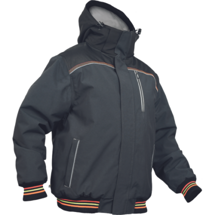 męska, zimowa kurtka pilotka • elastyczny pas • zapięcie na suwak kryty plisą na rzep, kaptur zintegrowany z kołnierzem, 2 kieszenie boczne, 2 kieszenie napiersiowe, 1 wewnętrzna kieszeń na telefon • 1 wewnętrzna kieszeń na telefon komórkowy, elastyczne mankiety z zapięciem na rzep, elementy odblaskowe