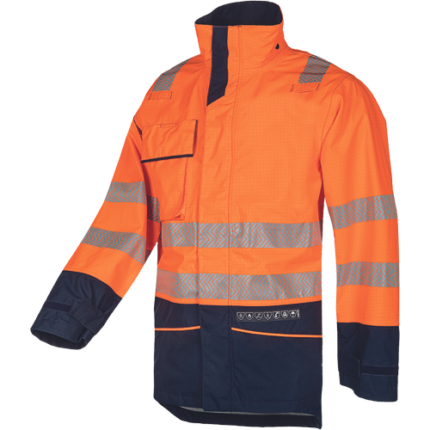 • men's HI-VIS anti-static rain jacket • YKK zip closure under flap with velcro fastening • 1 chest pocket • 2 side pockets • 2 inside chest pockets • flame retardant reflective segmented stripes • sleeve narrowing by velcro fastening • for TORVIK jacket inner insulating are different linings or fleeces as TOBADO or CARDINIA can be zipped in