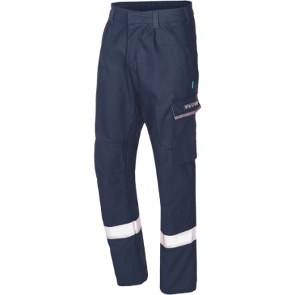 • men´s trousers with elastic waist • excellent protection against heat, flames and the thermal hazards of an electric ARC • front fly with zipper • 2 inset pockets with flap • 1 patched back pocket with flap closed by hidden press studs • 1 patched thigh pocket with flap • 1 ruler pocket with flap closed by concealed press studs • knee pockets • flame retardant reflective tape (50mm)