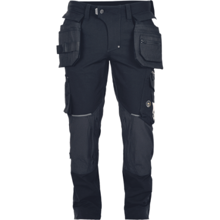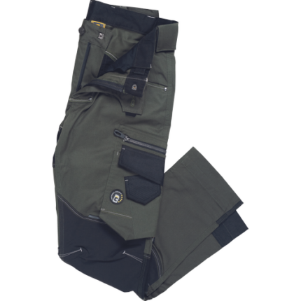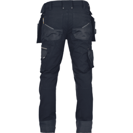 • męskie spodnie robocze wykonane z unikalnego materiału TrifibetexPRO® (czterokierunkowy nylon) • 2 przednie kieszenie klinowe, 2 tylne naszywane kieszenie zapinane na rzep, po lewej stronie duża kieszeń wielofunkcyjna, po prawej stronie wielofunkcyjne kieszenie na miarę i nóż + uchwyt na ołówek, metalowy pierścień „D”, wzmocnione nakolanniki z tkaniny CORDURA®, paski na narzędzia • patent elastycznego pasa • ozdobne potrójne szwy w kontrastowym kolorze • możliwość wydłużenia nogawek • odblaskowe detale ton w ton