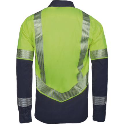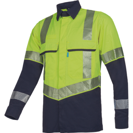 • męska koszula HI-VIS o właściwościach łukoochronnych, ognioodpornych i antystatycznych • zapięcie na zatrzaski ukryte pod patką • dobre właściwości regulacji wilgoci • 2 kieszenie napiersiowe zapinane na zatrzaski przykryte patką z kontrastową lamówką • wokół tułowia, rękawów i ramion nadrukowane taśmy odblaskowe • rękawy regulowane za pomocą zatrzasków