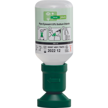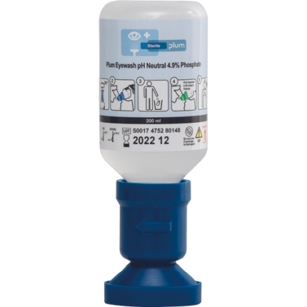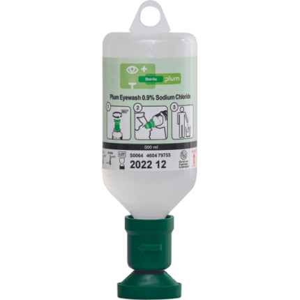 Plum Eyewash with sterile 0.9% sodium chloride solution is used to wash off dust, dirt and contamination and Plum Eyewash pH neutral 4.9% phosphate is for acid or base eye injuries; 500ml bottle with a special eye attachment for rinsing both eyes; suitable for individual use and for supplementing the DUO eye emergency station. Standard: EN 15154-4; flushing time approx. 2 minutes; the bottle is also ready for one-time use or for refilling the QuickSafe-Box; shelf life: 3 years (unopened bottle); pack of 6 pieces