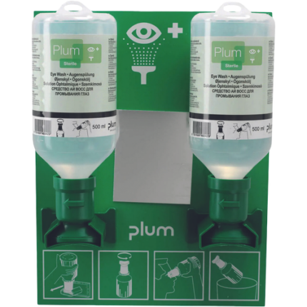 wall-mounted eye washers made of hard plastic for simple and quick first aid in case of eye injury; regardless of the circumstances, a quick reaction is usually required when the eye is hit; therefore, you must be well prepared in the workplace with the right first aid equipment; The Plum range includes eye wash stations with 1 and 2 bottles and combination stations with products of any size; Plum 4694 wall-mounted eye station contains 2 x 500ml Plum Eyewash 0.9% sodium chloride solution