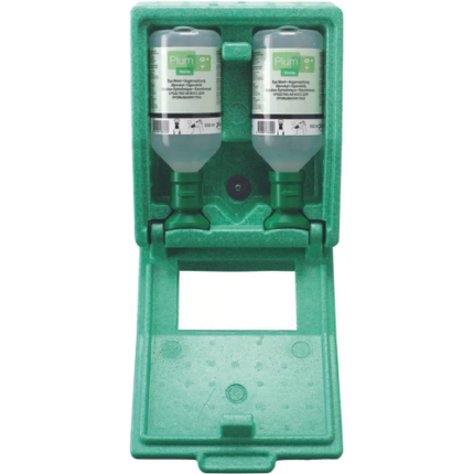 wall-mounted eyewash boxes made of maintenance-free material for easy and quick first aid for eye injuries; regardless of the circumstances, a quick response is usually required when the eye is hit; therefore, you need to be well prepared in the workplace with the right first aid supplies; the Plum line includes a variety of eyewash stations; Plum Combi-Box DUO Maxi contains 500 ml eyewash pH Neutral 4.9% and 1000 ml eyewash 0.9% sodium chloride solution