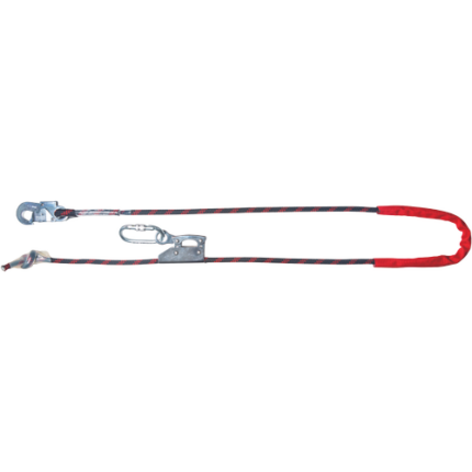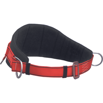 Biodrowy pas bezpieczeństwa, usztywniony, z regulowanymi zaczepami i klamrą do regulacji szerokości, z klamerkami do przypięcia torby na narzędzia, z uniwersalną liną bezpieczeństwa o długości 1,5 m z klamrą regulacyjną oraz ze stalowym zatrzaśnikiem z blokadą, spełnia wymogi normy EN 362, EN 354, EN 358 (CE 0082).