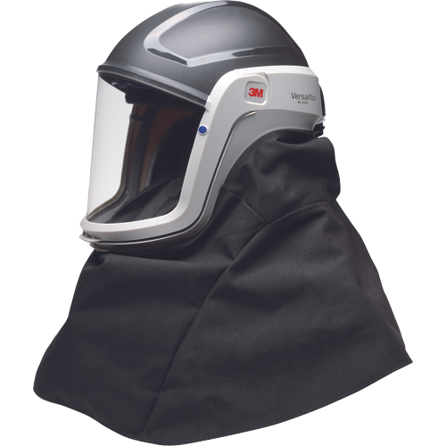 3M™ Versaflo™ helmet M-406 features a very durable protective nylon collar and a deflector that helps direct airflow inside the headpiece; the helmet has a visor with good peripheral vision and a downward view; the visor is coated with a polycarbonate layer for greater resistance to scratches and chemicals