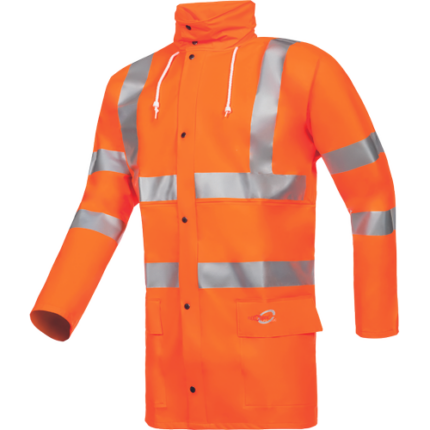 Szyte rękawice Hi-Vis z wodoodporną, oddychającą membraną, wykonane z poliestru z dodatkiem spandexu, w części chwytnej szybkoschnąca, synetyczna skóra z mikrofibry o grubości 0,8 mm, wposażone w piankę redukującą wibracje. W części chwytnej i na palcach zadrukowane wysokiej jakości silikonem. Opuszki palców pokryte syntetyczną skórą. Podszewka poliestrowa. Neoprenowy mankiet zapinany na rzep Velcro. Plastikowy haczyk z oznaczeniem rozmiaru. EN ISO 10819
