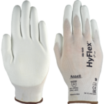 Bezszwowe rękawice z nylonowej dzianiny, powleczone poliuretanem w części chwytnej dłoni i na palcach z elastycznym ściągaczem i odpornością na obtarcie klasy 4, odpowiednie do lekkich aplikacji.