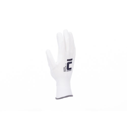 Dziane, bezszwowe, poliestrowe rękawice z cienką warstwą poliuretanu w części chwytnej dłoni i na palcach, z elastycznym ściągaczem.