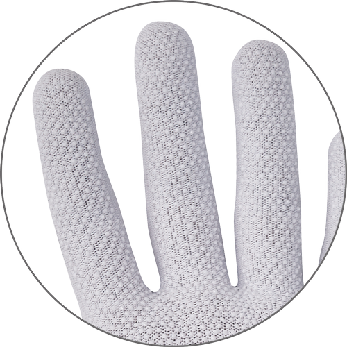 Szyte rękawice Hi-Vis z wodoodporną, oddychającą membraną, wykonane z poliestru z dodatkiem spandexu, w części chwytnej szybkoschnąca, synetyczna skóra z mikrofibry o grubości 0,8 mm, wposażone w piankę redukującą wibracje. W części chwytnej i na palcach zadrukowane wysokiej jakości silikonem. Opuszki palców pokryte syntetyczną skórą. Podszewka poliestrowa. Neoprenowy mankiet zapinany na rzep Velcro. Plastikowy haczyk z oznaczeniem rozmiaru. EN ISO 10819