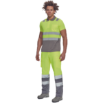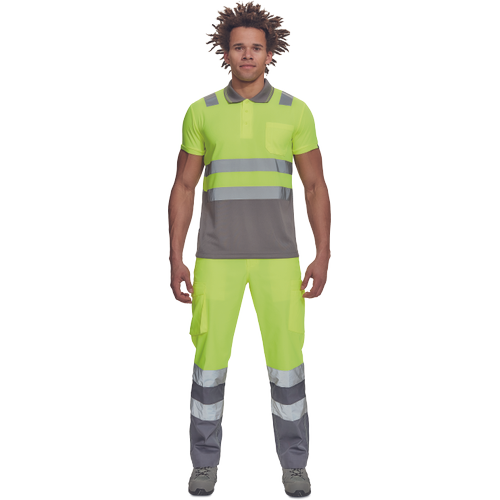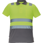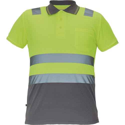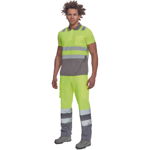 • ostrzegawcza koszulka polo z odblaskowymi taśmami o szerokości 5 cm na ramionach i na obwodzie, zapięcie na 3 guziki, dziany kołnierzyk i obszycie rękawów