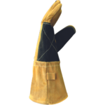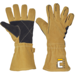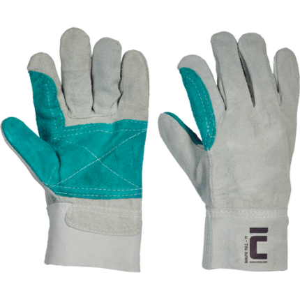 Rękawice skórzane dla spawaczy, wykonane z dwoiny bydlęcej, z podszewką bawełnianą, wzmacniane w części chwytnej i okolicach kciuka, szyte nićmi kewlarowymi.