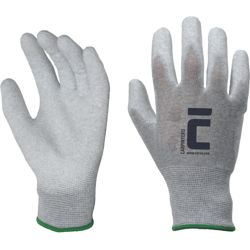 Dziane, bezszwowe, antystatyczne rękawice poliestrowe z włóknem węglowym, powlekane warstwą poliuretanu na dłoni i palcach; elastyczny mankiet; uiglenie 15 GG.