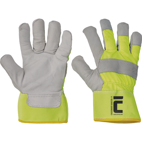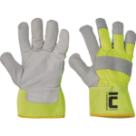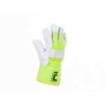 Ocieplane rękawice wzmacniane delikatną, jednokolorową licową skórą wołową w części chwytnej dłoni, grzbiet dłoni oraz mankiet wykonane z dzianiny poliestrowej w kolorze odblaskowym.