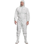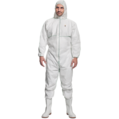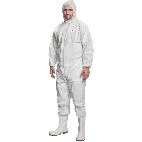 Kombinezon ochronny z kapturem i zamkiem błyskawicznym przykrytym patką, elastyczne ściągacze z gumką na rękawach i nogawkach, kombinezon ochronny z kategorii CE III, typ 5 i 6, chroni przed niektórymi związkami chemicznymi i cząstkami radioaktywnymi.