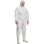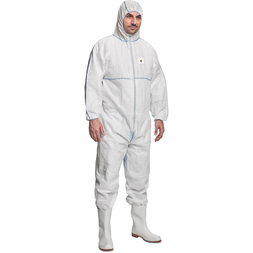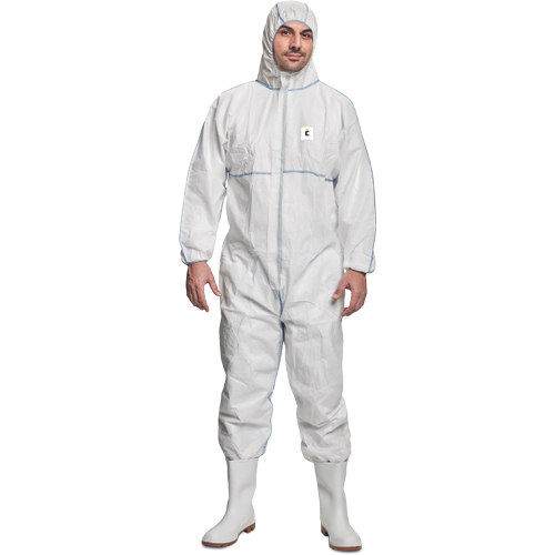 Kombinezon ochronny z kapturem i zamkiem błyskawicznym przykrytym patką, elastyczne ściągacze z gumką na rękawach i nogawkach, kombinezon ochronny z kategorii CE III, typ 5 i 6, chroni przed niektórymi związkami chemicznymi.