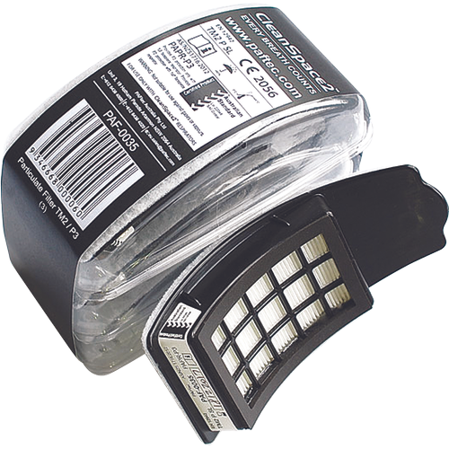 CleanSpace particulate filter P3 TM3 P SL R is suitable for protection against airborne particulates (dust, mists and fumes); important: the filters are compatible with all CleanSpace PAPR power units; when selecting a CleanSpace filter please consult a health and safety specialist for advice on the appropriate respiratory equipment and filter use; compatible with all CleanSpace PAPR power units; easy and quickly fitted and removed from the power unit; product weight 21 g; product dimensions 120 x 45 x 45 mm; sold in a pack of 3 filters