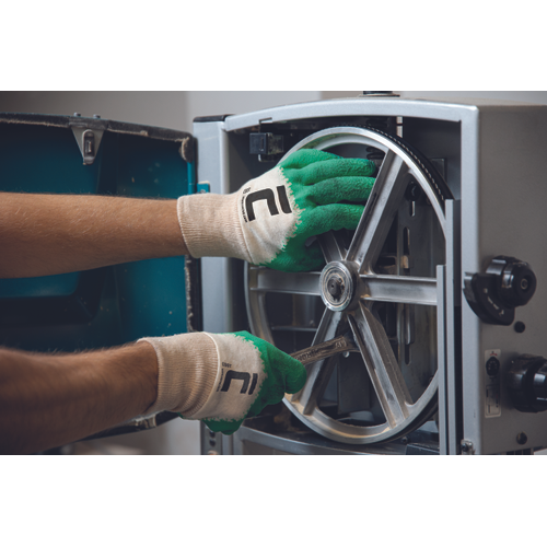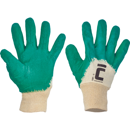 Zielone rękawice szyte z bawełnianej dzianiny, powierzchnia antypoślizgowa, elastyczny ściągacz, dłonie i palce pokryte kauczukiem.