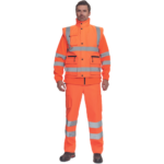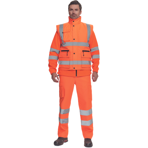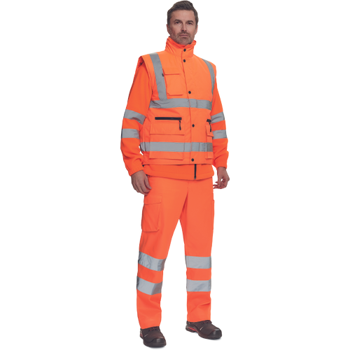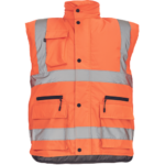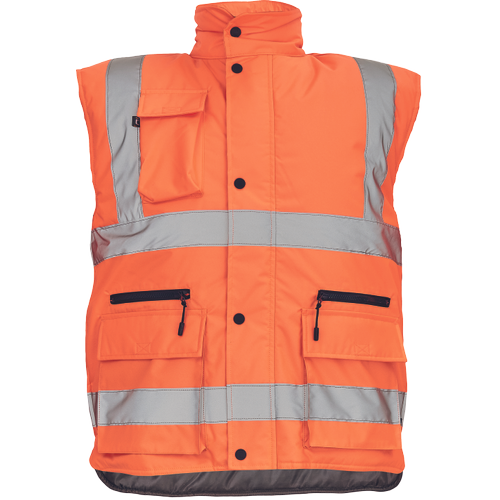 • ocieplana męska kamizelka ostrzegawcza z kapturem ukrytym w kołnierzu • odblaskowe taśmy o szerokości 5 cm na ramionach i w dolnej części • zamek błyskawiczny przykryty plisą zapinaną na guzik i• 1 kieszeń na piersi na telefon, 2 duże kieszenie przednie z patkami i 2 kieszenie z zamkami błyskawicznymi powyżej