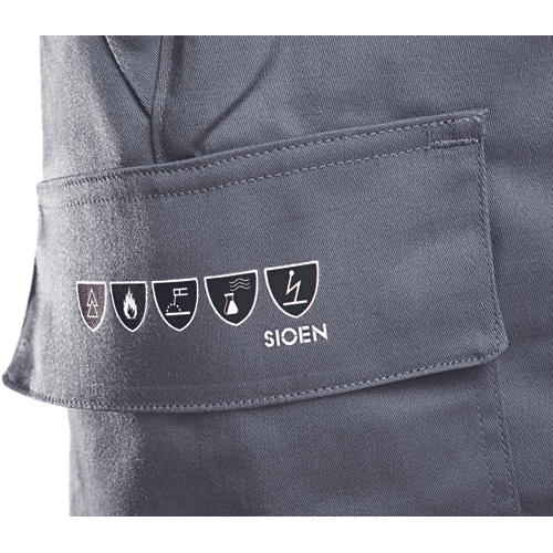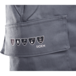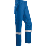 • men's pants with ARC protection • flame retardant and anti-static • front fly with zipper closure • elastic waist • 2 side pockets with press stud closure hidden under flap • 1 back pocket with press stud closure hidden under flap • 1 back right thigh pocket with press studs hidden under flap • knee pockets for knee pads insertion • flame retardant double stiched reflective stripes around bottom legs • suitable for welding