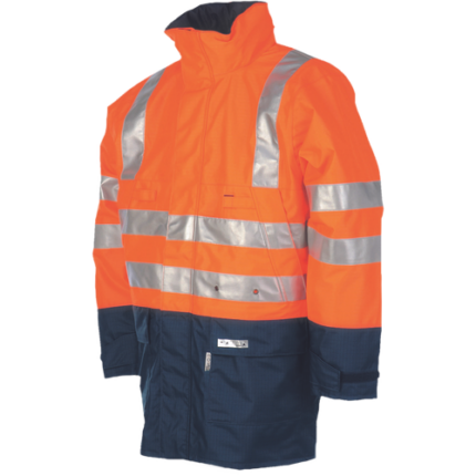Antystatyczna, niepalna i odporna na czynniki chemiczne kurtka z bawełnianą, niepalną podszewką, kapturem w kołnierzu i podklejonymi szwami.