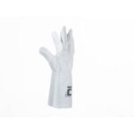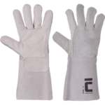 Rękawice skórzane z licowej skóry wołowej w części chwytnej dłoni, z dwoiny wołowej na grzbiecie, sztywny mankiet o szerokości 15 cm, bez podszewki. Certyfikat: prace spawalnicze – typ B