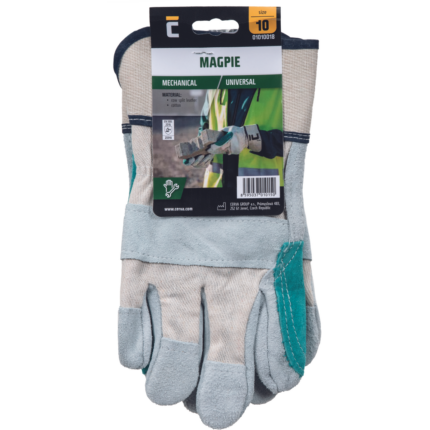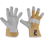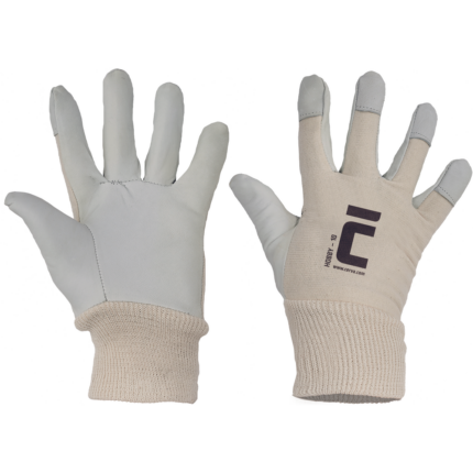 Rękawice wzmacniane skórą wołową licową, z podszewką, grzbiet dłoni oraz mankiet wykonane z tkaniny bawełnianej.