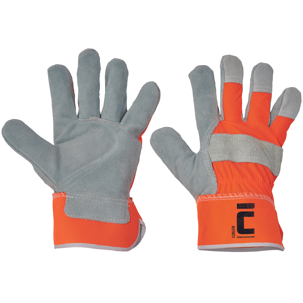 Rękawice wzmacniane jednokolorową dwoiną wołową w części chwytnej dłoni, grzbiet dłoni oraz mankiet wykonane z dzianiny poliestrowej w kolorze odblaskowym.